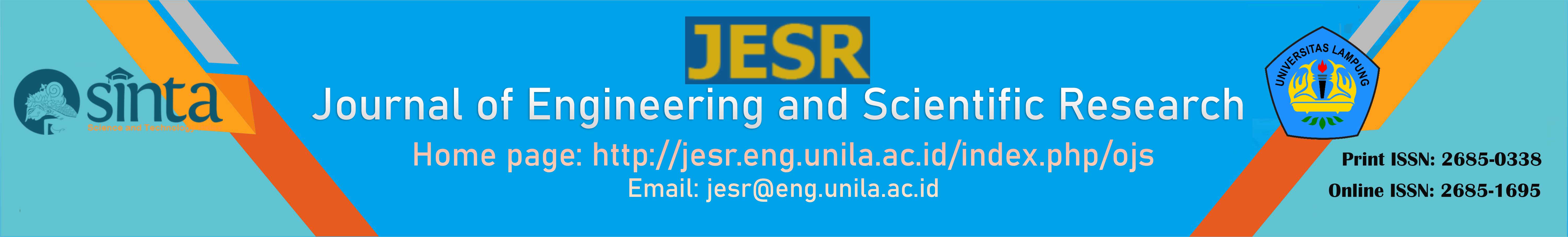 Journal of Engineering and Scientific Research (JESR) is initiated and persistently managed by a group of lecturers from interdisciplinary fields in the Engineering Faculty, Universitas Lampung. JESR is a peer-reviewed international journal that publishes original research and critical review articles in engineering and applied sciences.  JESR accepts manuscripts from and is not limited to all engineering fields (mechanical, electrical, industrial, civil and environment, chemical and industrial, information technology, geophysics, geodesy, etc.), architecture, applied science (agrotechnology, biomedical, applied physics, applied chemistry, materials, computer, biotechnology, etc.), and other multidisciplinary research. The main criteria for publication include originality, scientific quality, and interest in the aim and focus.